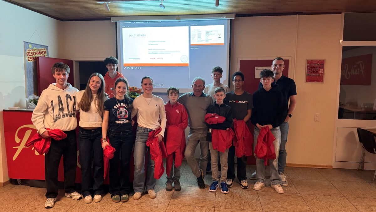 Geehrt wurden neben den Vereinsjubilaren auch einige verdiente Sportlerinnen und Sportler aus dem Bereich der Leichtathletik. Zusammen mit Chef-Trainer Wilfried Faßbender wurde das Outfit der Athleten mit einem Präsent vervollständigt.